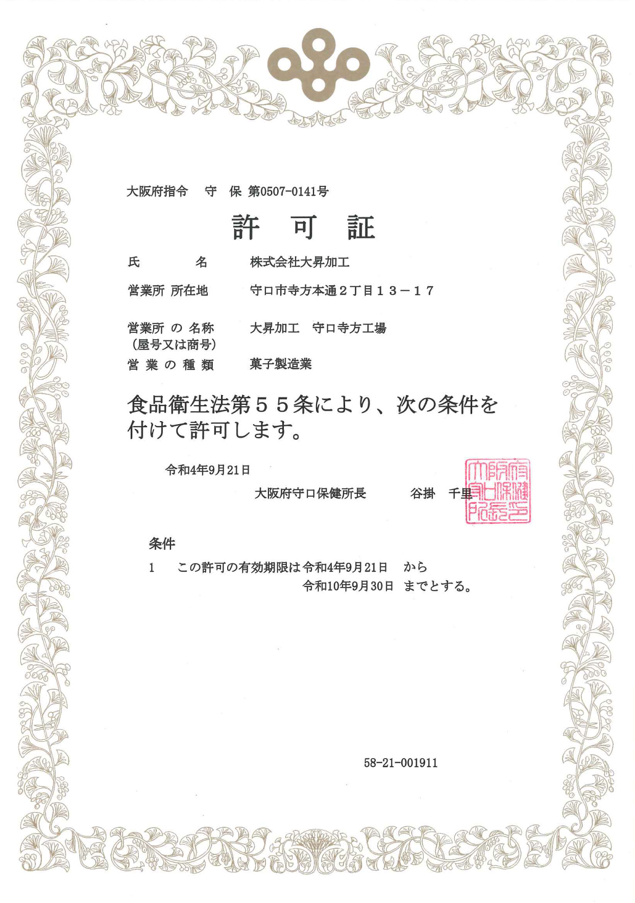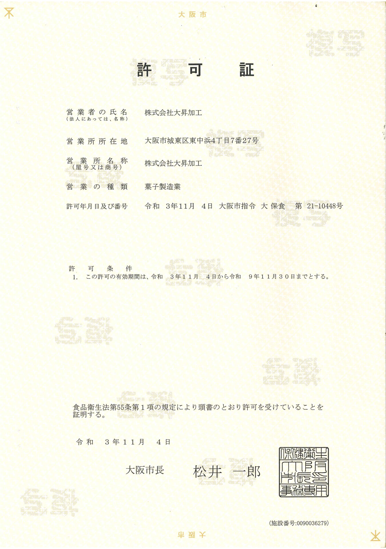 菓子製造業許可証
