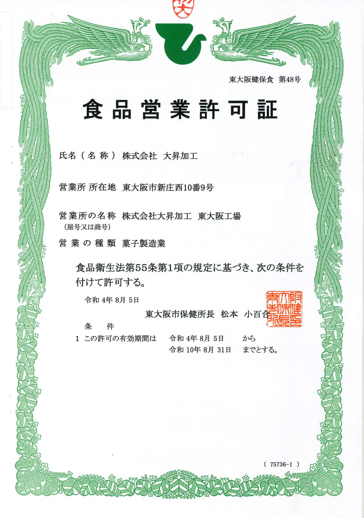 大昇加工では東大阪工場、城東倉庫、守口寺方工場で菓子製造業許可証を取得しております。