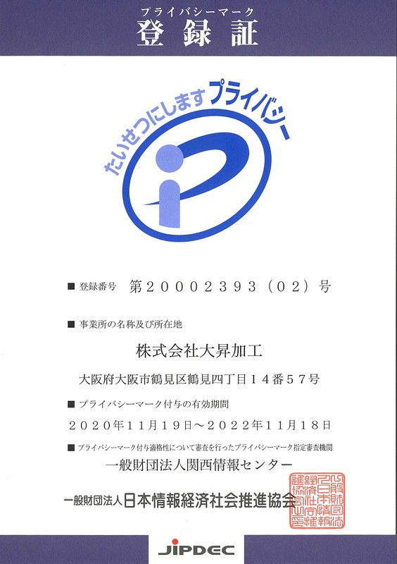 大昇加工では今後もプライバシー認定事業者として、個人情報の保護に努め、多様化するニーズに対応を進めてまいります。