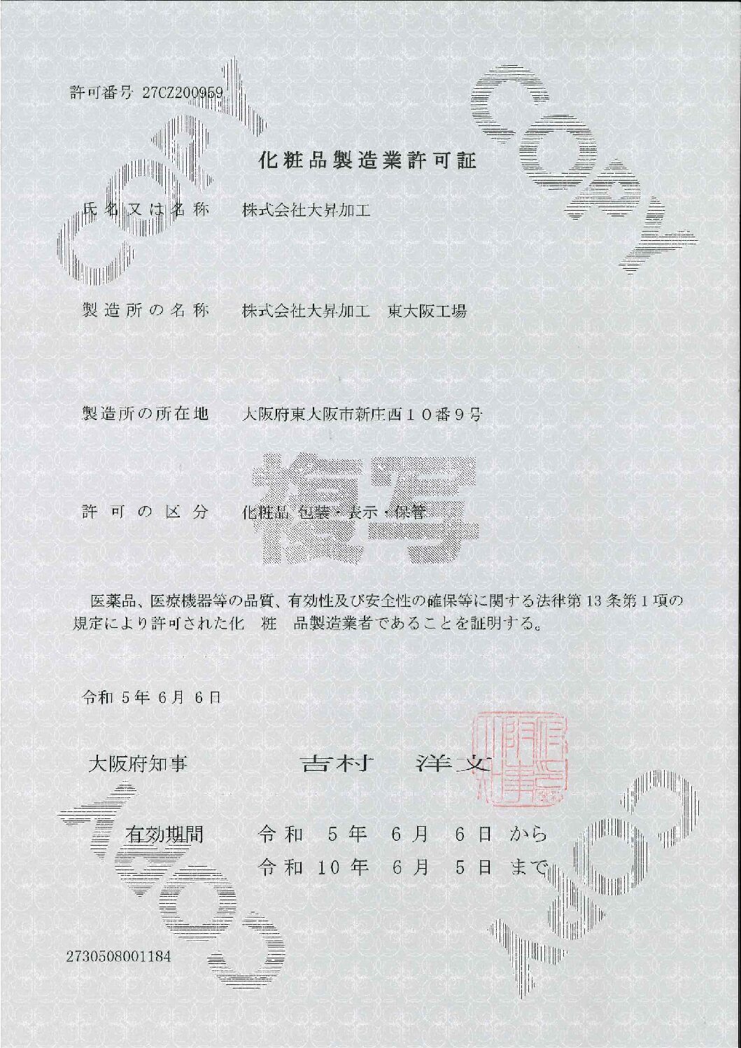 この度、弊社東大阪工場は「化粧品製造業許可」を取得しました。