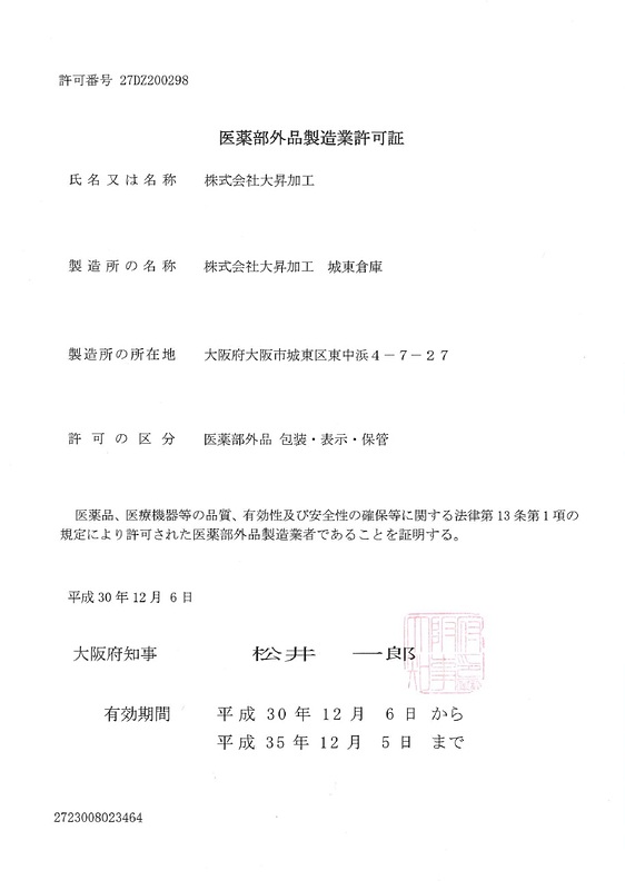この度、弊社城東倉庫は八尾工場に続き「医薬部外品製造業許可」を取得しました。