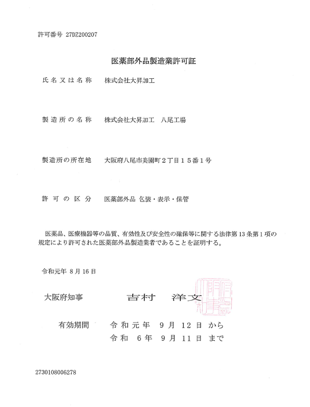 弊社、八尾工場の「医薬部外品製造業許可」を更新致しました。