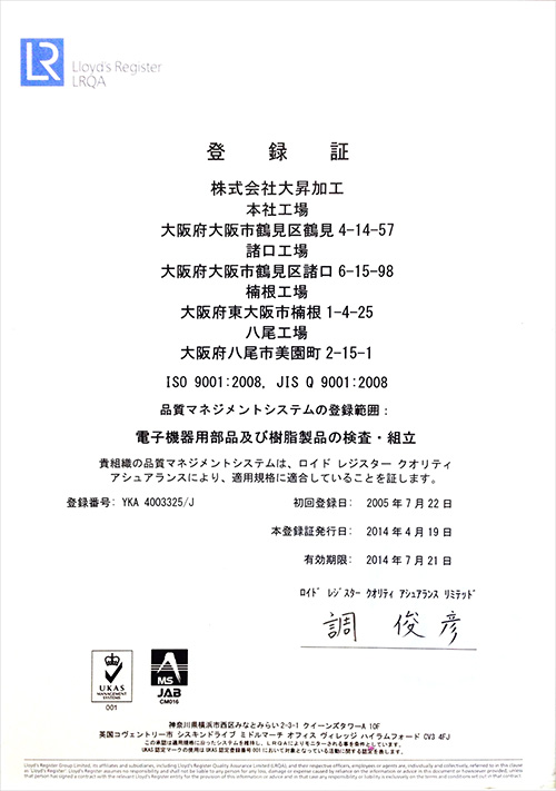 ISO 9001:2008 更新いたしました。