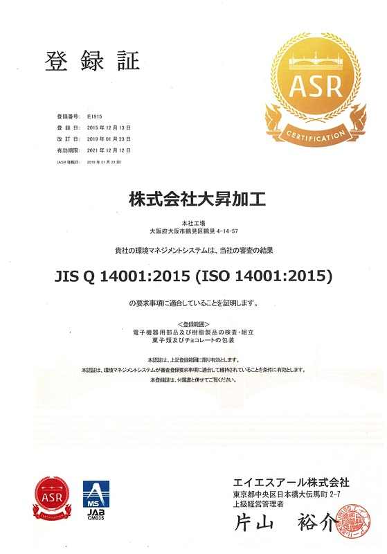 当社は2015年4月より、ISO14001の取得に向けて活動をしておりましたが、この度「ISO14001:2015」(環境マネジメントシステム)を取得いたしました。